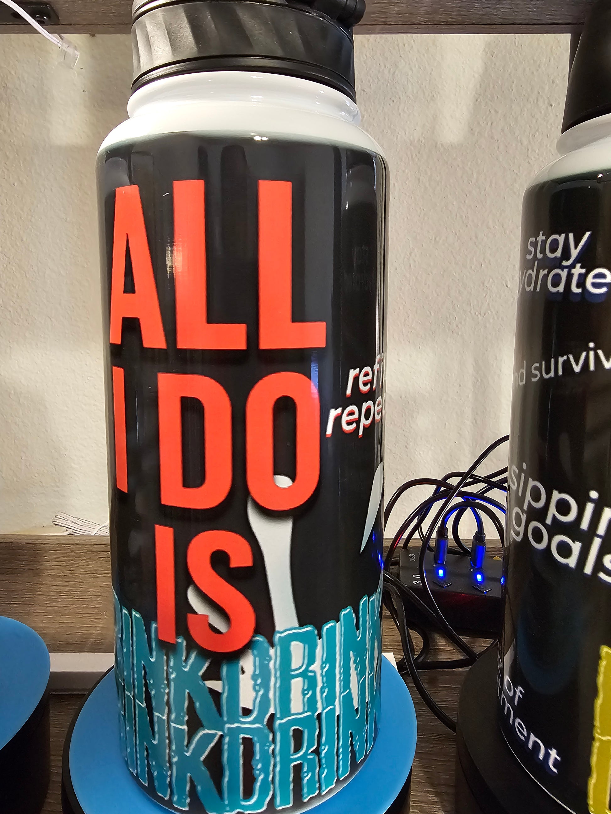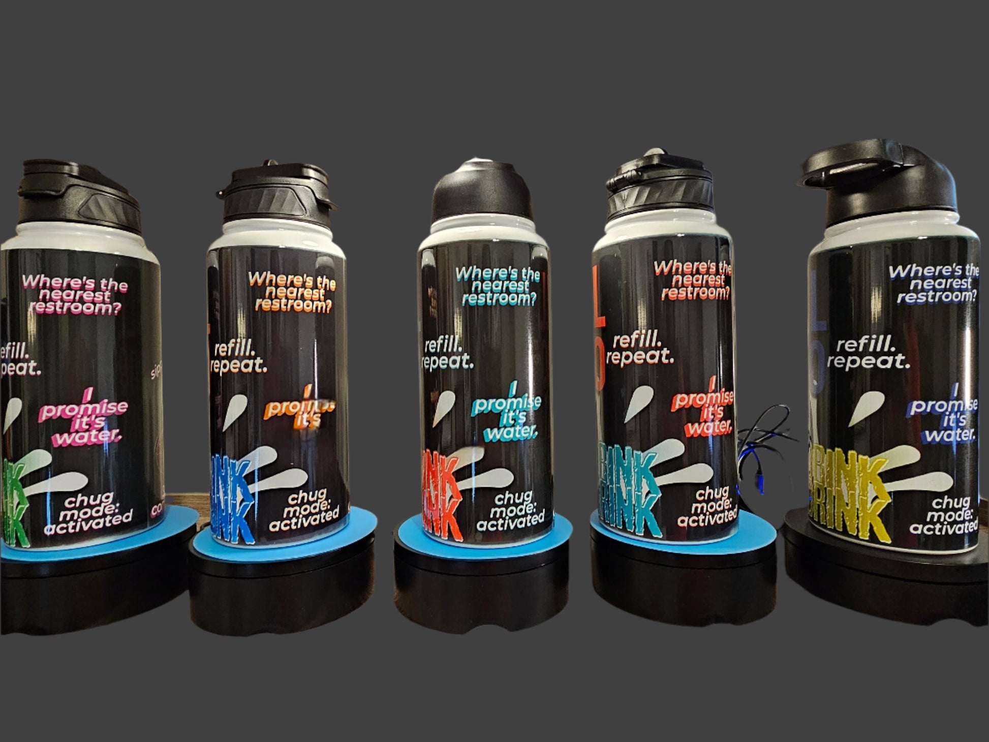 - Bold, full-wrap design with splash graphic and humorous hydration phrases