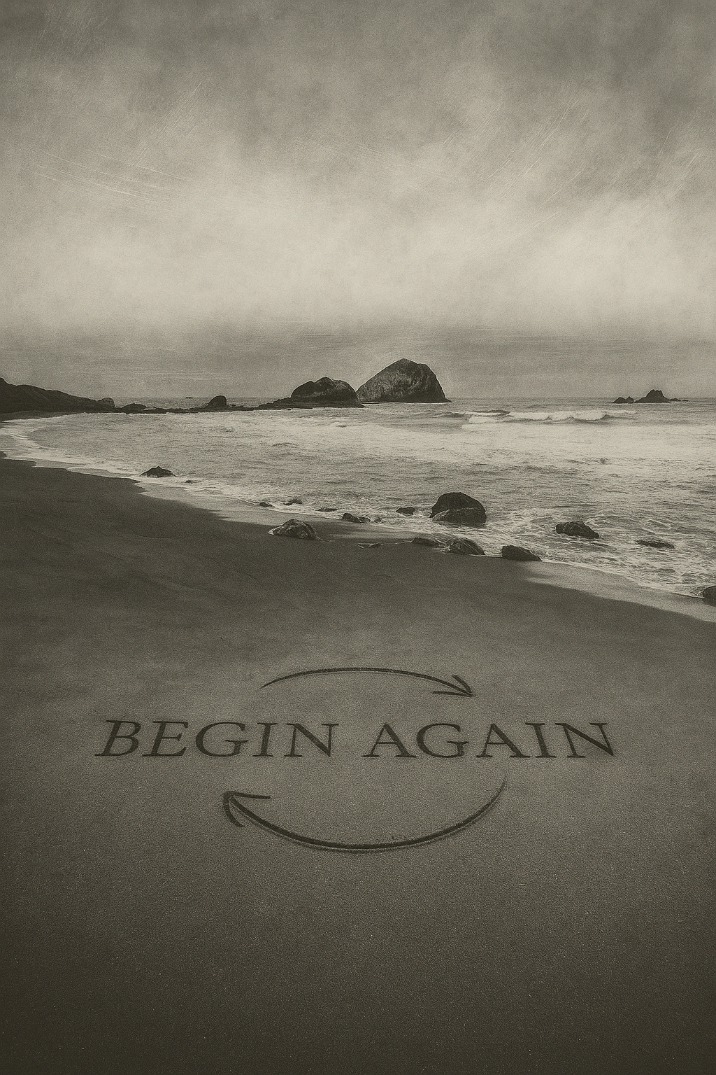Etched softly into the sand is the phrase “Begin Again”, like a whisper from the tide — a reminder of renewal, resilience, and permission to start fresh. The dark rock formations and blurred horizon evoke solitude, strength, and inner peace.