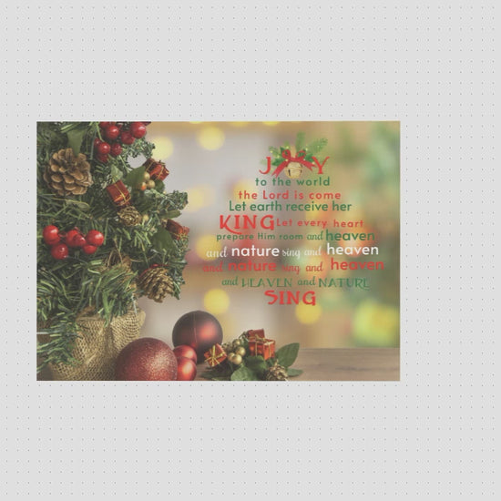 This 7" x 5" (in.) card features a festive front with a table top Christmas tree and ornaments, and the warm glow of Christmas lights in the background. The front message is the first verse of Joy to the World, beautifully shaped like a tree. The inside is adorned with a light gold background and classic Christmas decorations in the corners. The inside message wishes you a holiday season full of the joy and peace that this wonderful time of year brings. May your heart be light, your home be warm, and your spirit be bright as we celebrate the true meaning of Christmas. Joy to the world, for the Lord has come! Merry Christmas and Happy New Year! Green envelopes included.