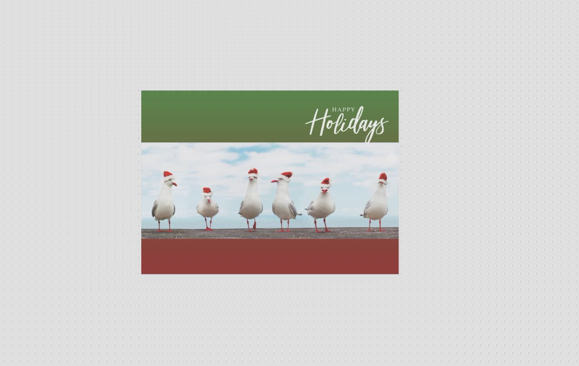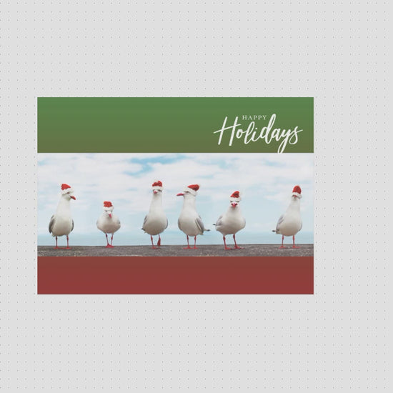 This festive holiday card showcases six charming sea gulls adorned in Santa hats, perched on a beach with the picturesque blue and white sky in the backdrop. The card front also features a vibrant green and deep red background adorned with the caption "Happy Holidays". Inside, a stunning green and red design with Christmas pine and holly adorning the corners creates an inviting atmosphere. The card message: wishing you all the joys of the Season.
