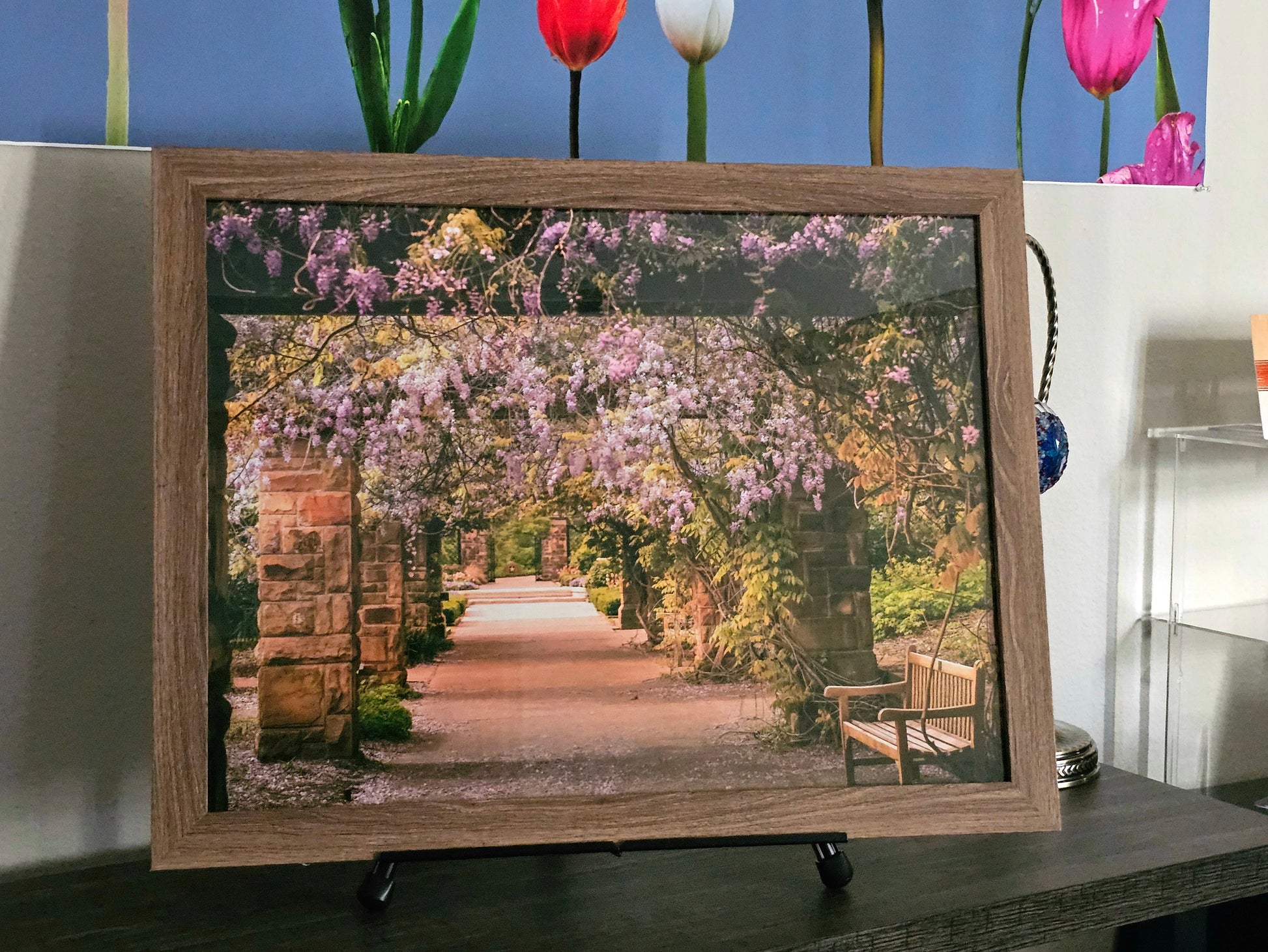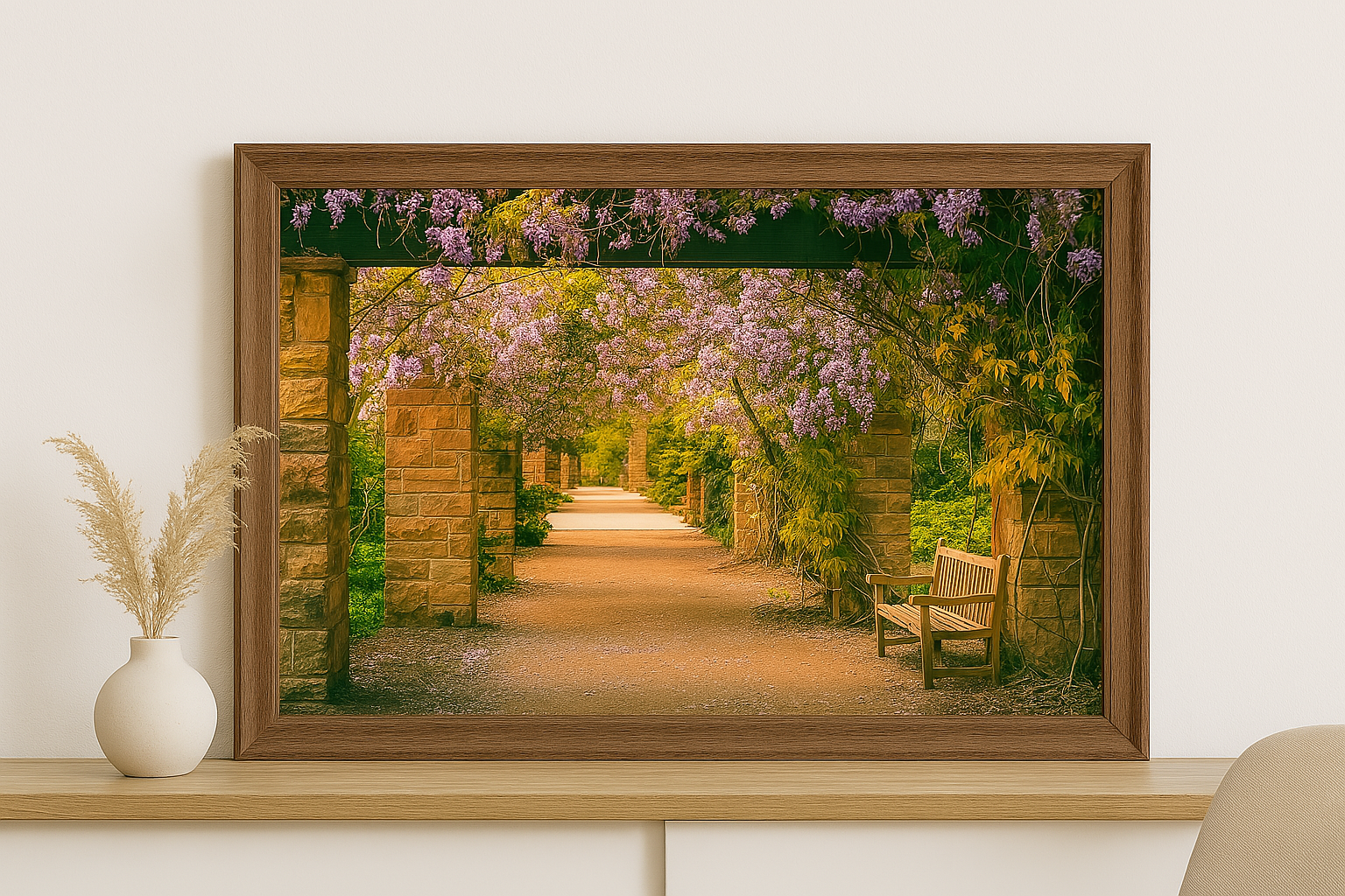 Bring the serene charm of nature indoors with the "Enchanting Garden Pathway" original photography print from Framed Greetings. Captured by Antoinette Washington Photography, this inviting image features a beautiful garden pathway adorned with lush wisteria blossoms in shades of lavender and violet, framed by classic stone pillars and a peaceful wooden bench.