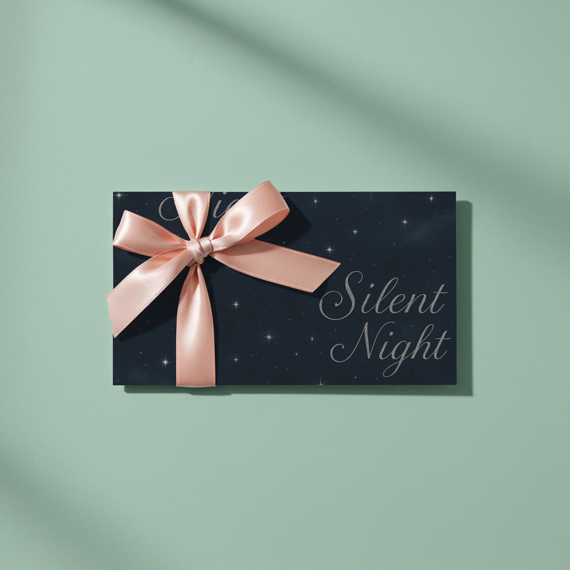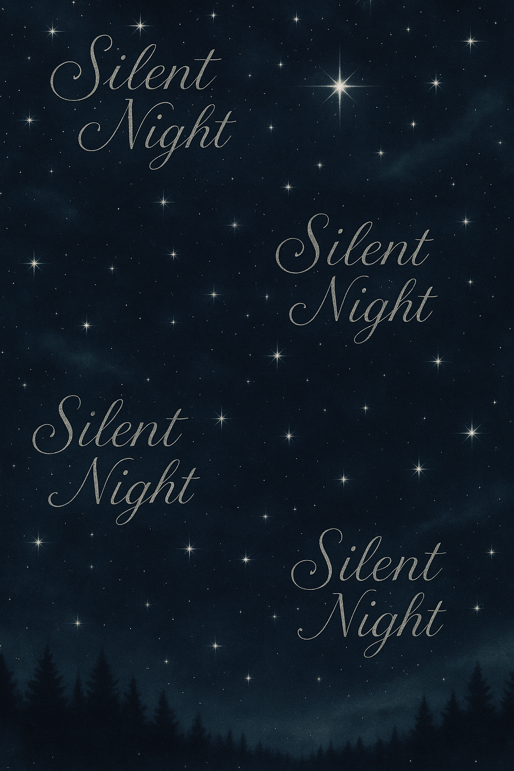 - Silent Night – navy sky with silver stars, evergreen silhouettes, and softly glowing Silent Night text drifting among the stars.