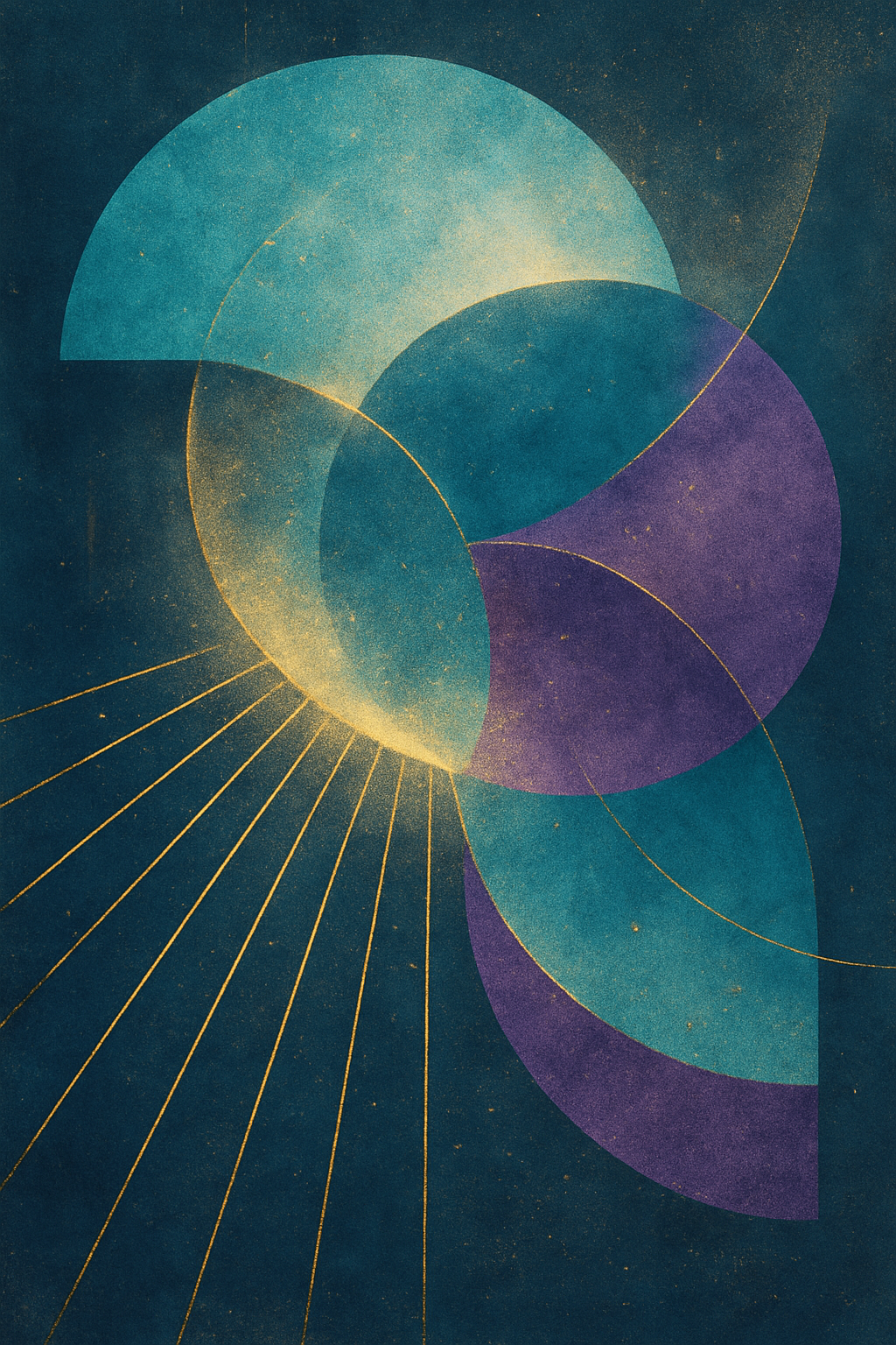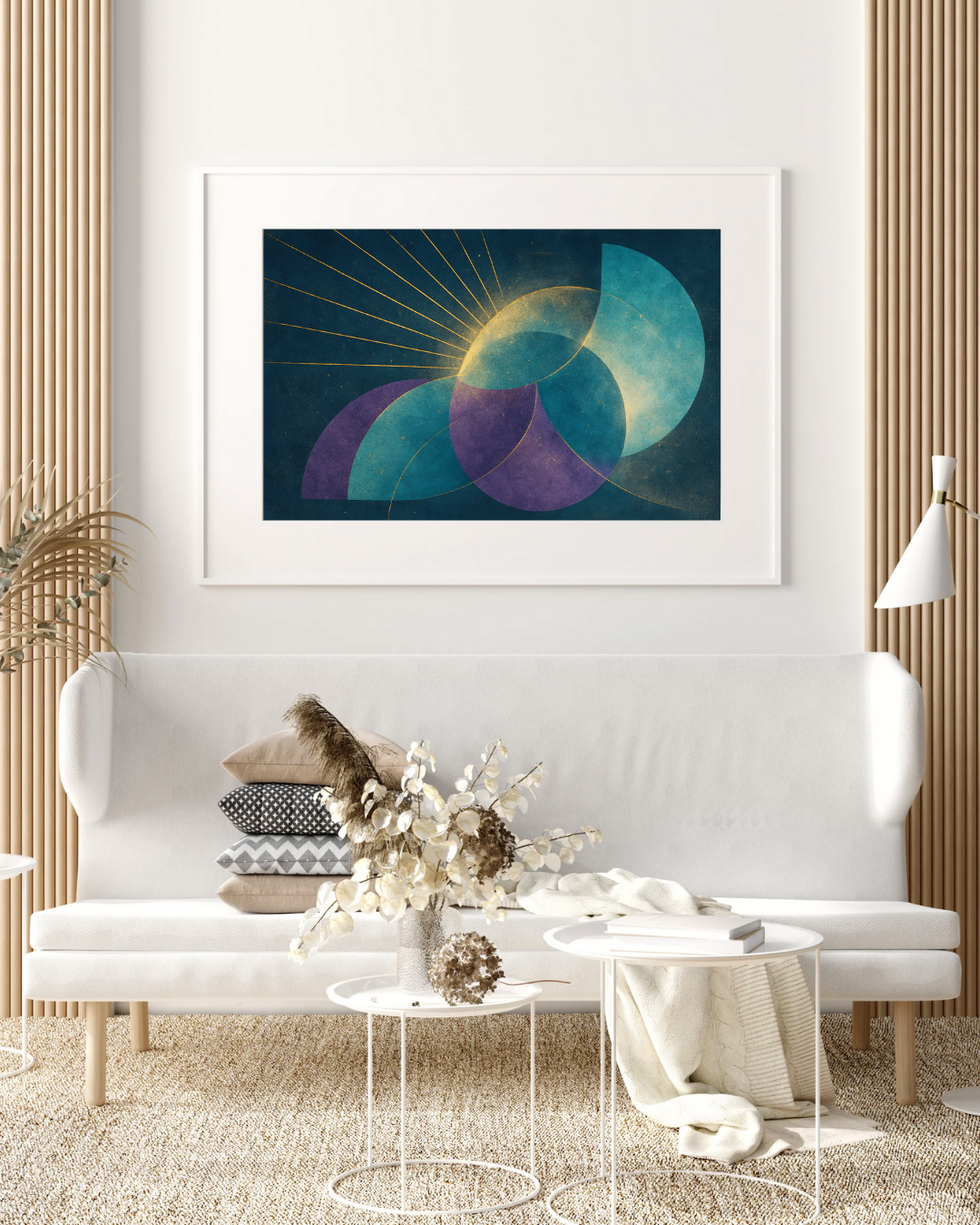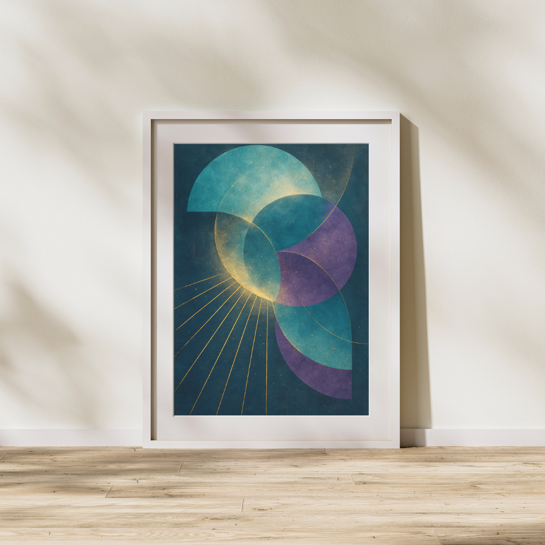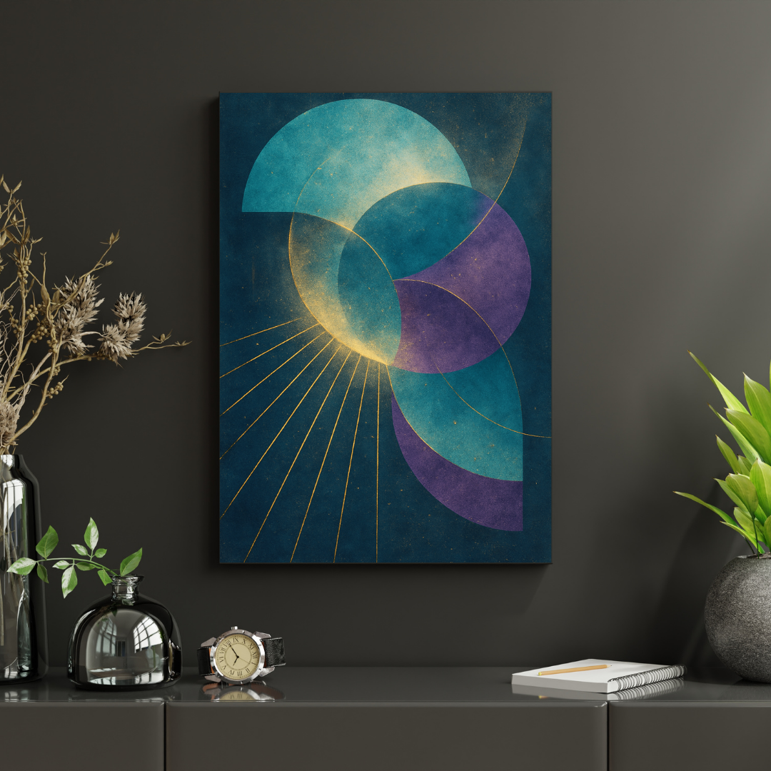 Opulence in Motion is a radiant dance between color, form, and light. Bold arcs in rich turquoise and deep royal purple intertwine gracefully against a velvety textured backdrop. From their meeting point, brilliant rays of gold burst outward—symbolizing energy, alignment, and a life beautifully in motion.