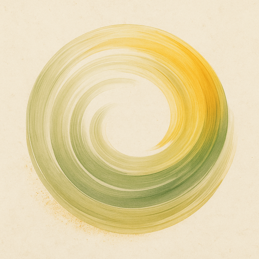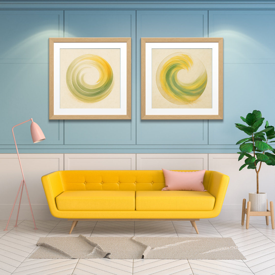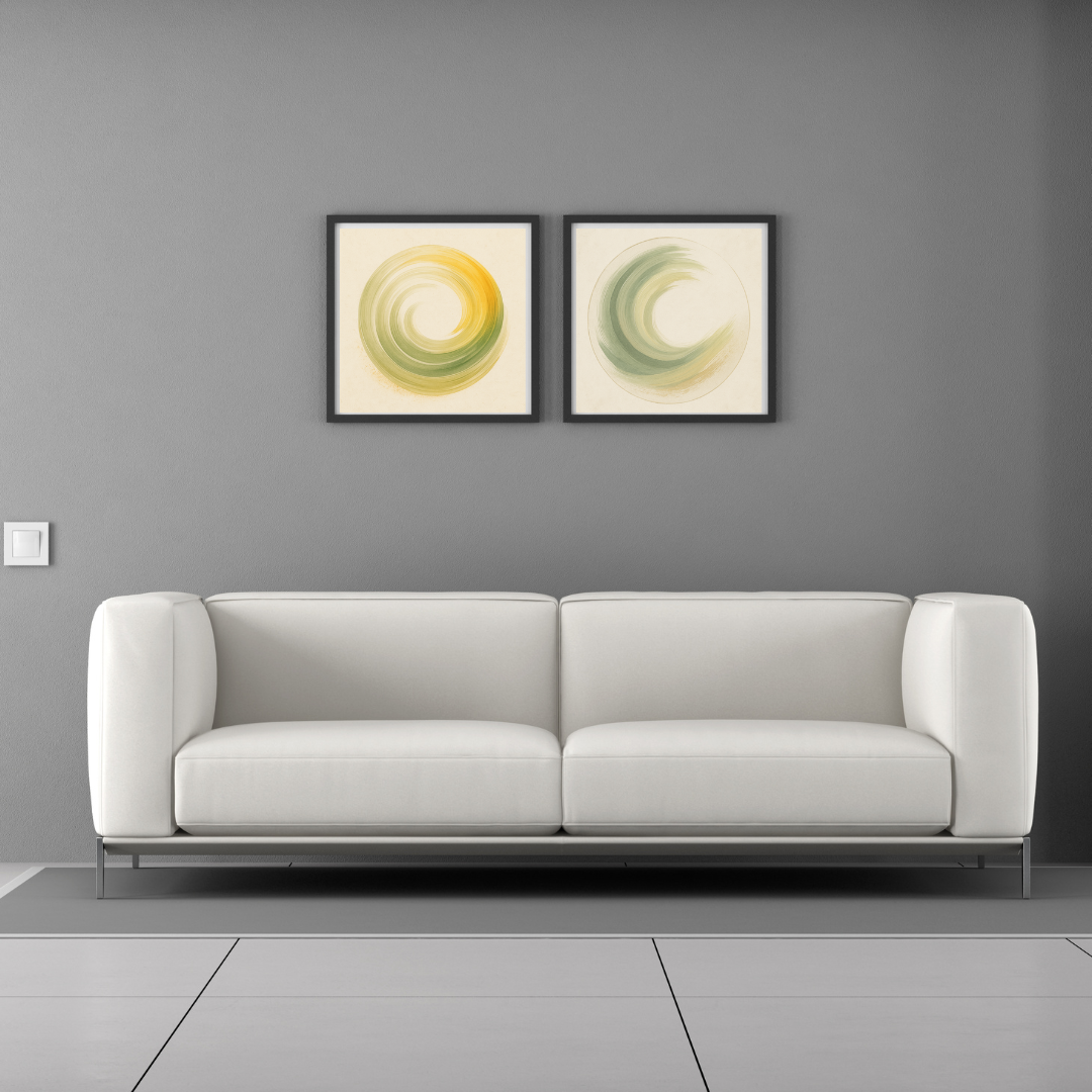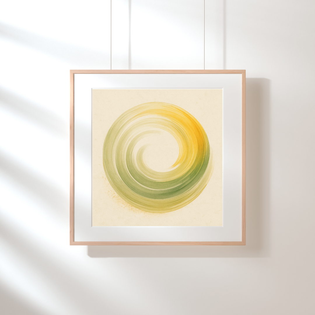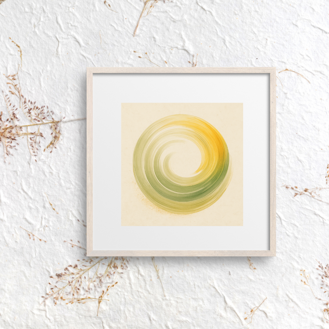 A bloom born of stillness. Whispers in Bloom closes the Serenity Rising Series with a powerful upward gesture—brushstrokes of yellow, green, and golden beige unfurl like a wave just beginning to flower. Encircled by faint geometry, the shape pulses with quiet energy and soft joy.